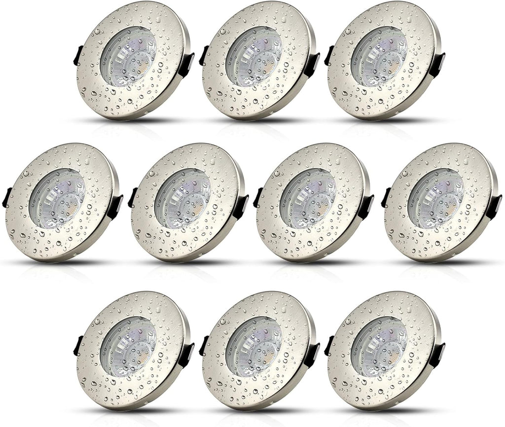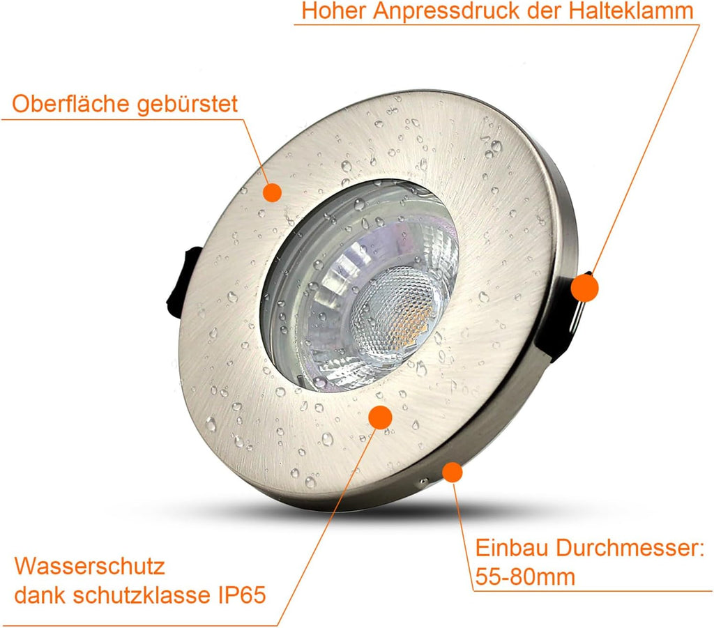 Spritzwassergeschütztes Komplett-Set für Badezimmer, Küche und überdachte Außenbereiche. Der IP44-zertifizierte Einbaurahmen aus rostbeständiger Metalllegierung mit Edelstahl-Optik schützt zuverlässig vor Spritzwasser. Inklusive 5W GU10 LED Spot mit Glasabdeckung.